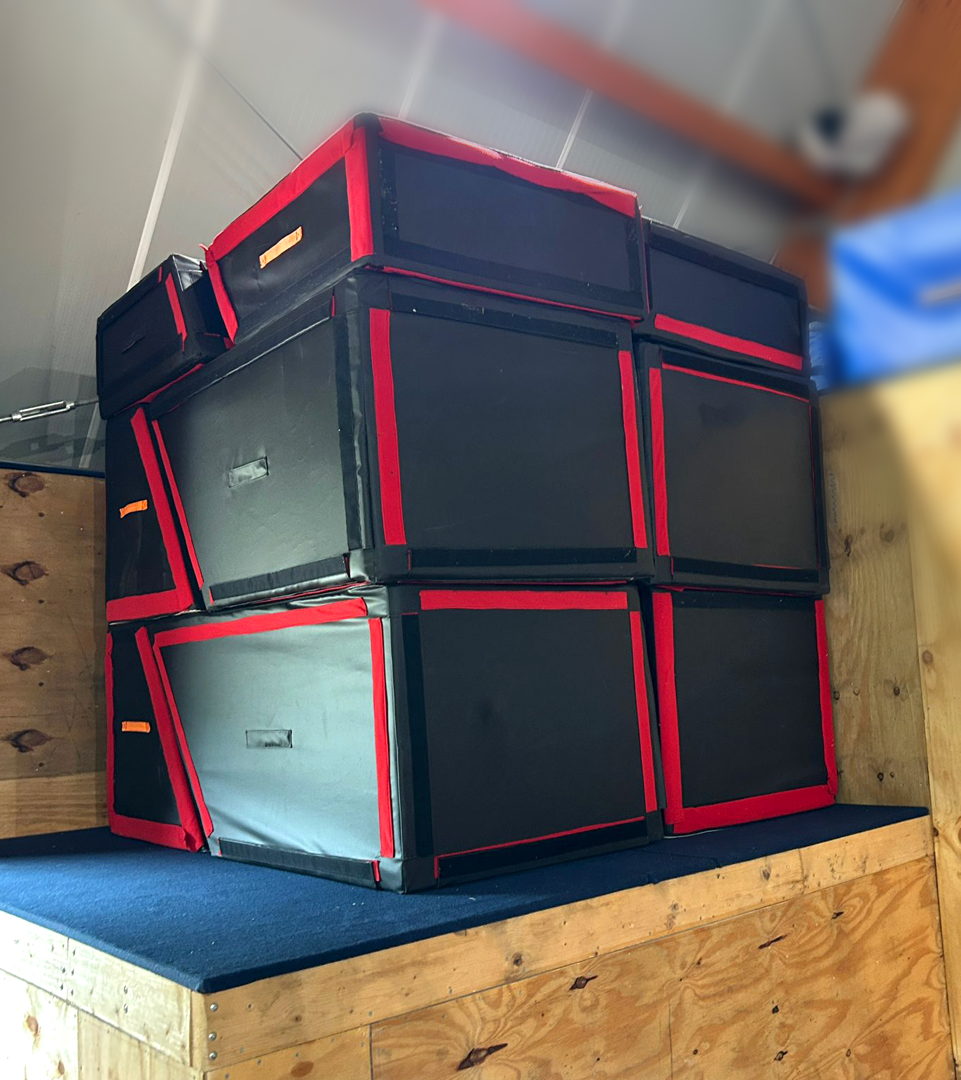 Il sistema di connessione tra i moduli si basa sull’impiego del velcro, una soluzione ampiamente collaudata nel settore delle discipline acrobatiche. La parte morbida viene cucita direttamente sulle facce dei blocchi, mentre delle bandelle in tessuto PVC, dotate di strisce di velcro ruvido, vengono applicate sui lati. Questo design consente un assemblaggio rapido e sicuro, minimizzando il rischio di abrasioni durante l’uso.